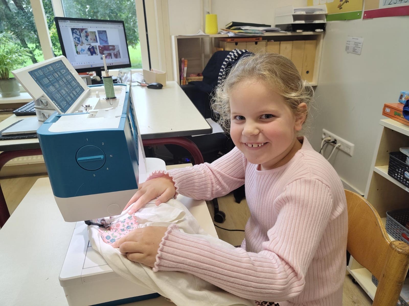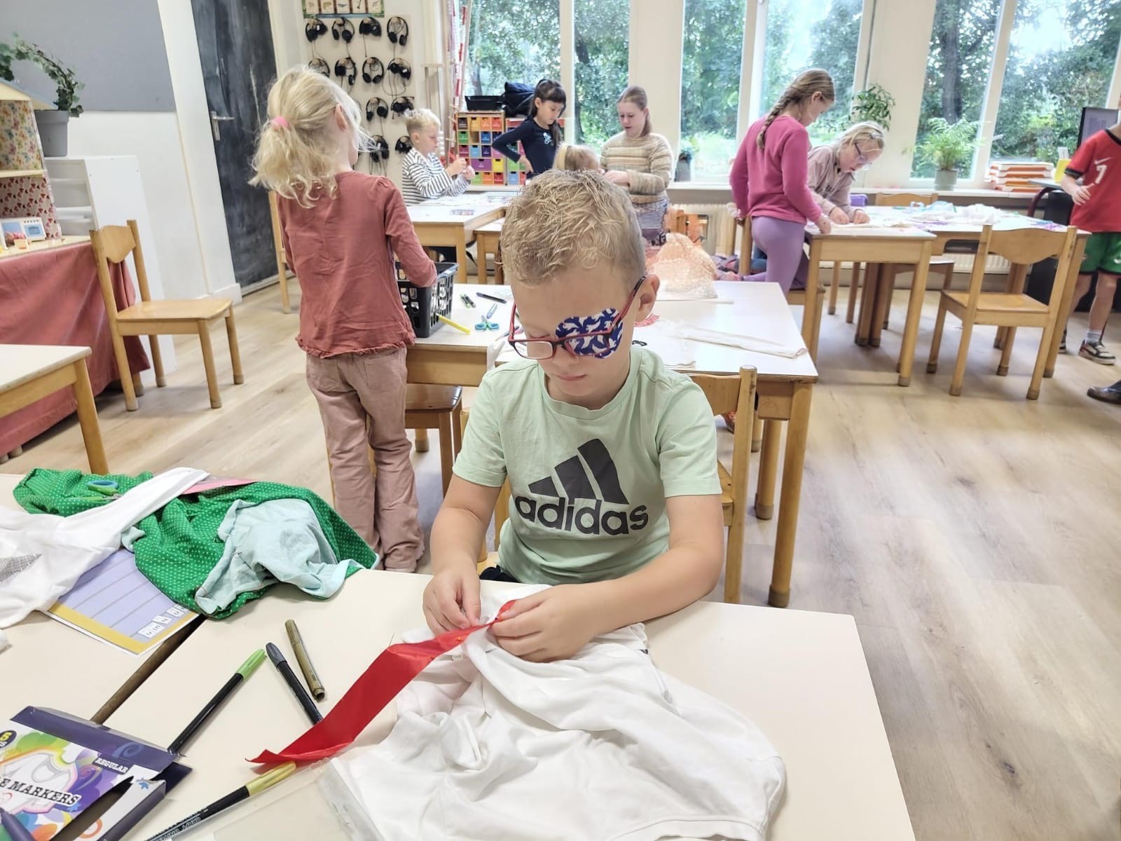 Gisteren leek onze klas wel een naaiatelier! De kinderen zijn bezig om een wit T-shirt te pimpen. Zij mogen stofjes, band, lint, knopen en textielstiften gebruiken. Er werd met de hand genaaid, maar ook met de naaimachine van juf Renée. Nieuwsgierig hoe de T-shirts eruit gaan zien....? Na 16 oktober post ik het resultaat!