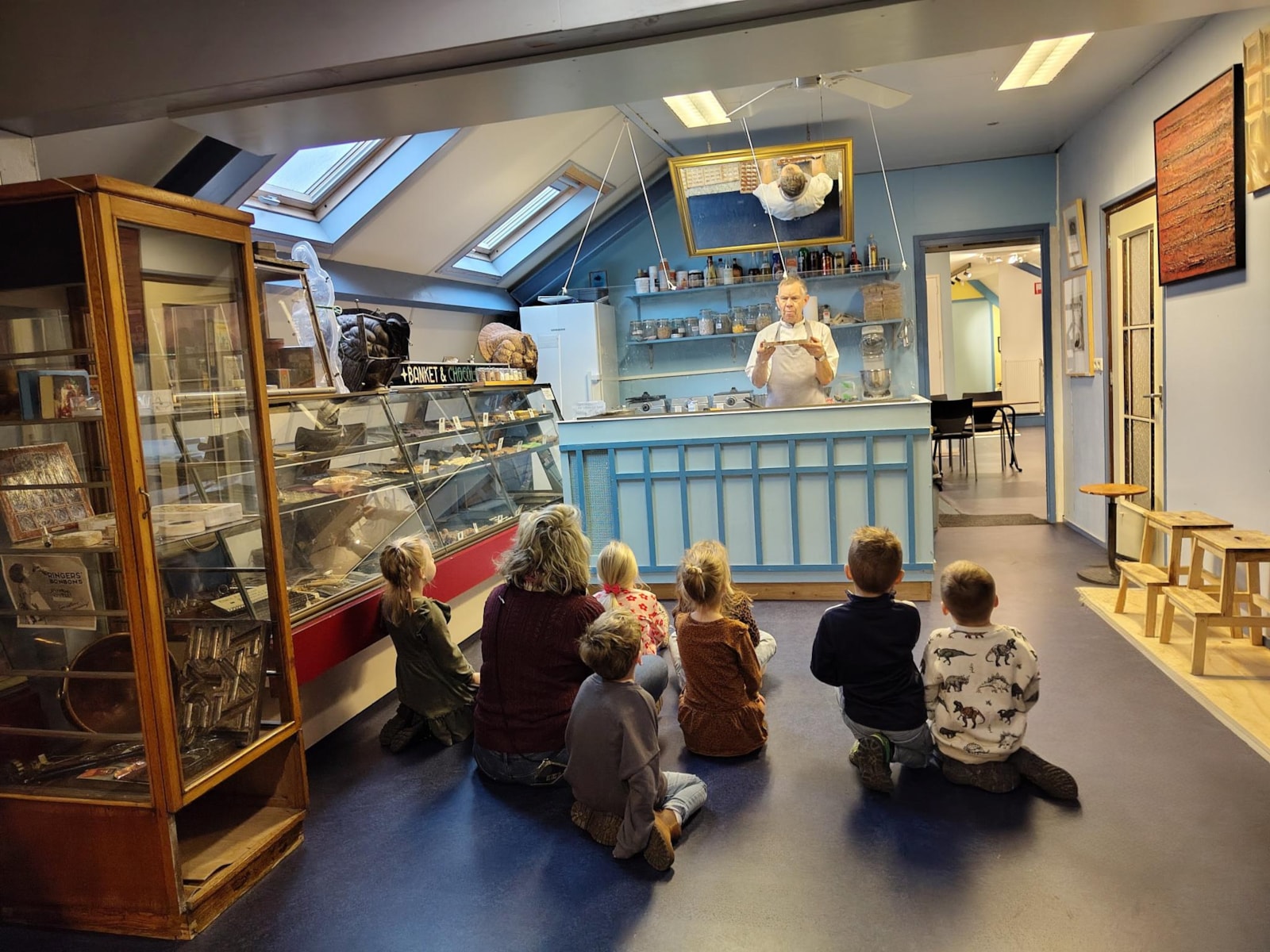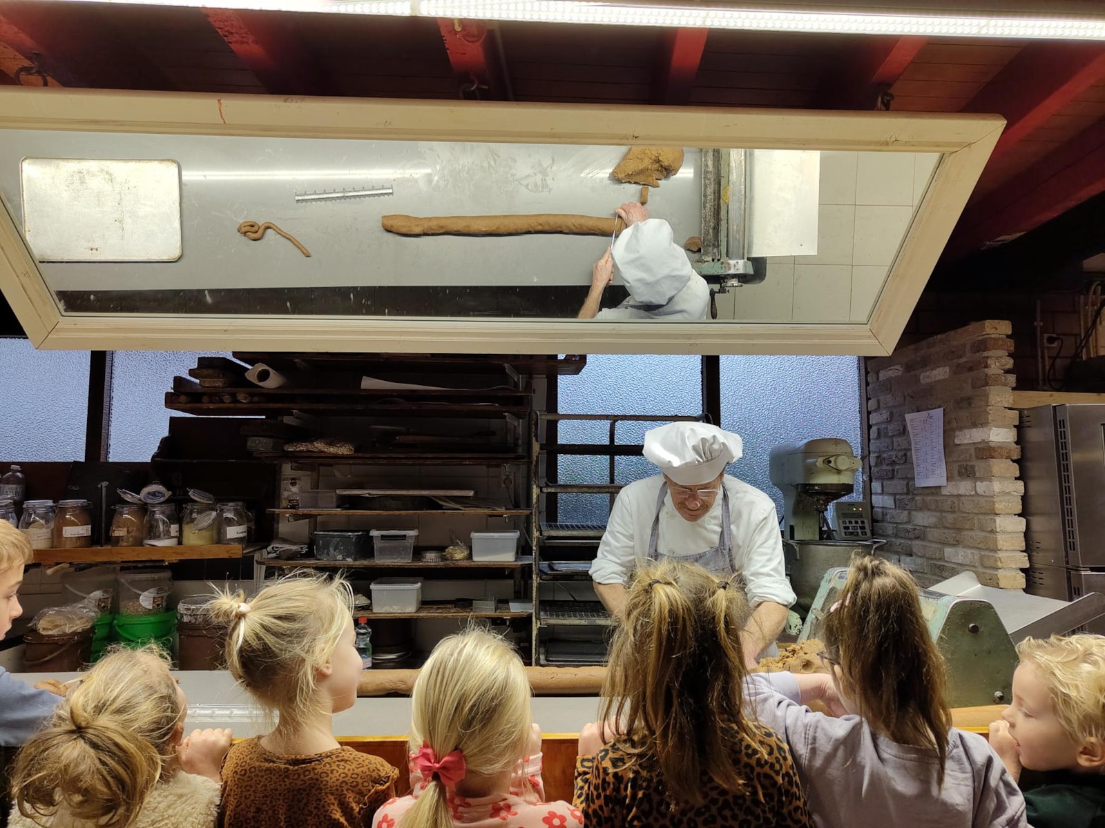 De kinderen werden onder alle auto’s verdeeld en we reden gezamenlijk als één lange stoet richting Medemblik. Eenmaal daar aangekomen gingen we tegelijkertijd naar binnen en we konden na het ophangen van de jassen direct plaatsnemen bij de bakker. De bakker was op dat moment druk in de weer met speculaasdeeg en de kinderen keken vol verwondering mee. De gehele groep werd vervolgens verdeeld in vier kleine groepjes en we zijn daarna aan de slag gegaan met verschillende workshops; pepernoten rollen, een film kijken, speculaas versieren en uitleg over het maken van chocoladebonbons. De kinderen vonden het ontzettend leuk en we kijken terug op een geslaagde ochtend bij het bakkerijmuseum!