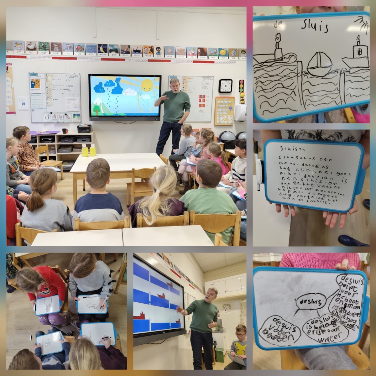 We hadden namelijk bezoek van Jarno Winter, een echte sluiswachter van de sluizen bij Enkhuizen en Lelystad. Jarno nam de kinderen mee in zijn wereld: hoe een sluis werkt, waarom sluizen belangrijk zijn en wat er allemaal komt kijken bij zijn werk. De leerlingen luisterden vol aandacht en stelden nieuwsgierig vragen. Het was prachtig om te zien hoe geboeid ze waren.