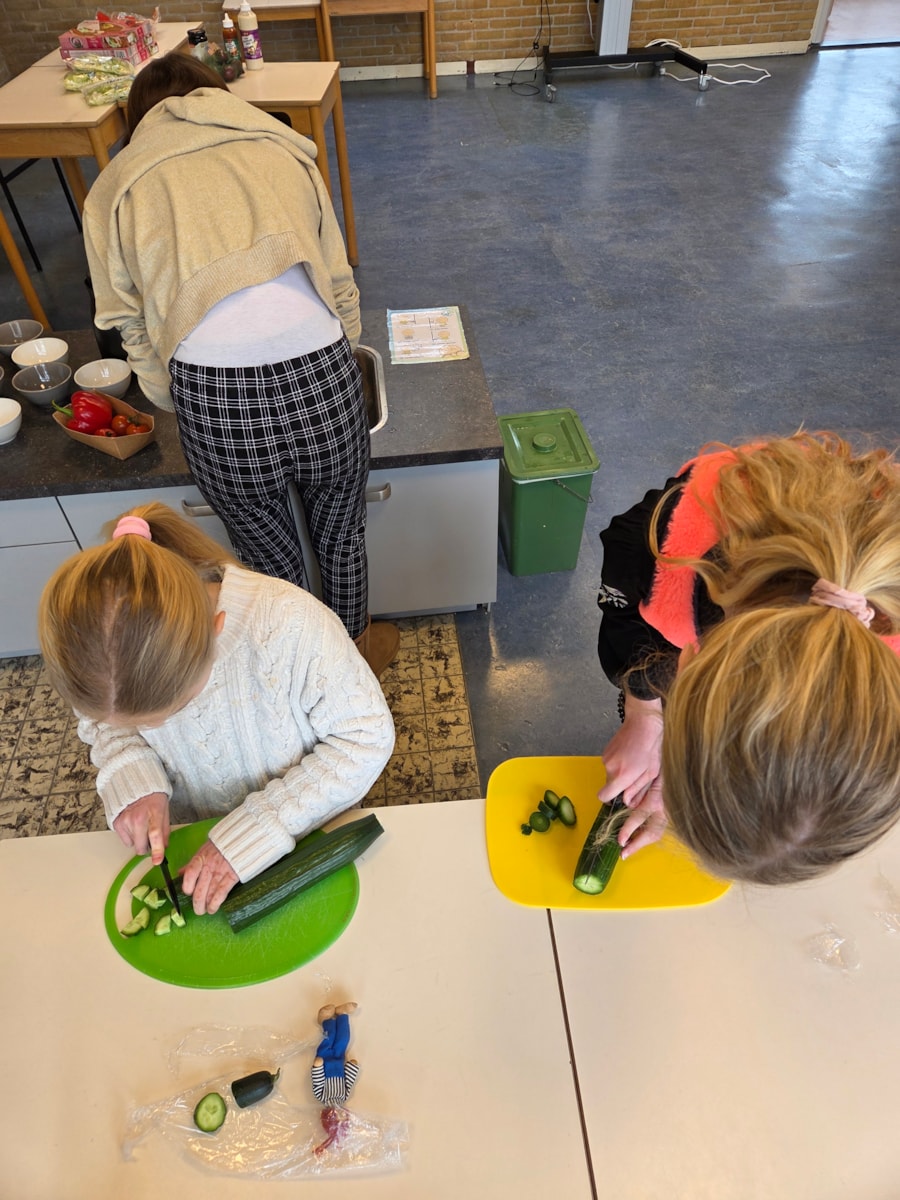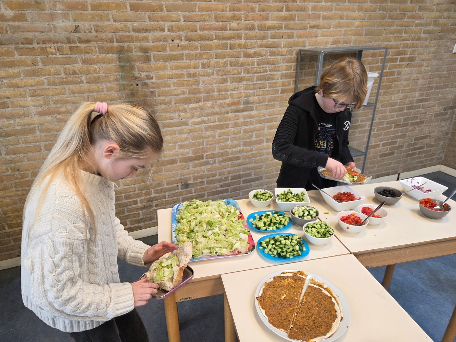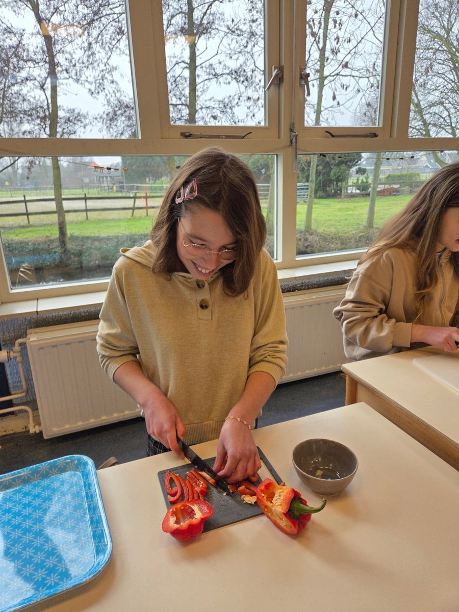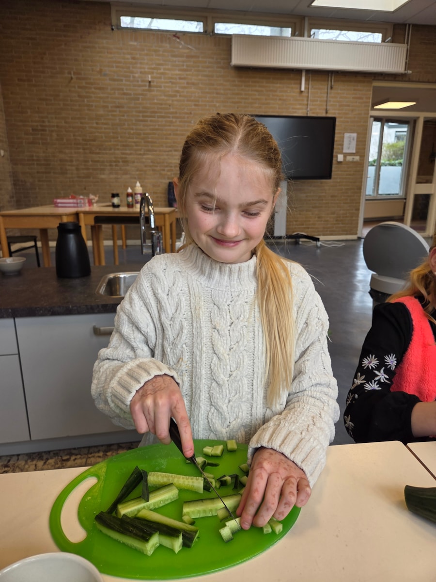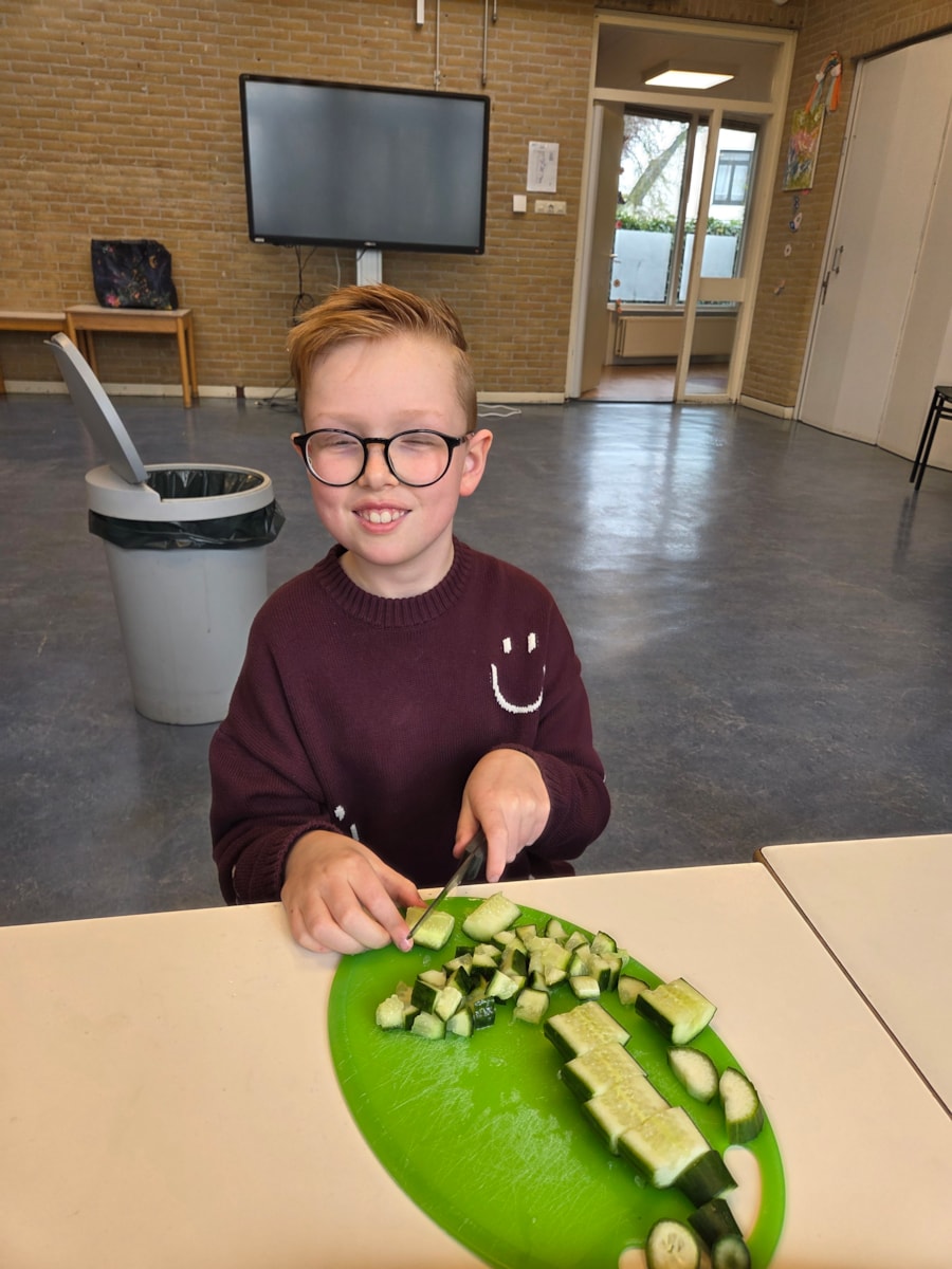 De pizza’s werden in de oven opgewarmd en ondertussen waren er veel kinderen die hielpen met het snijden van alle groente.
